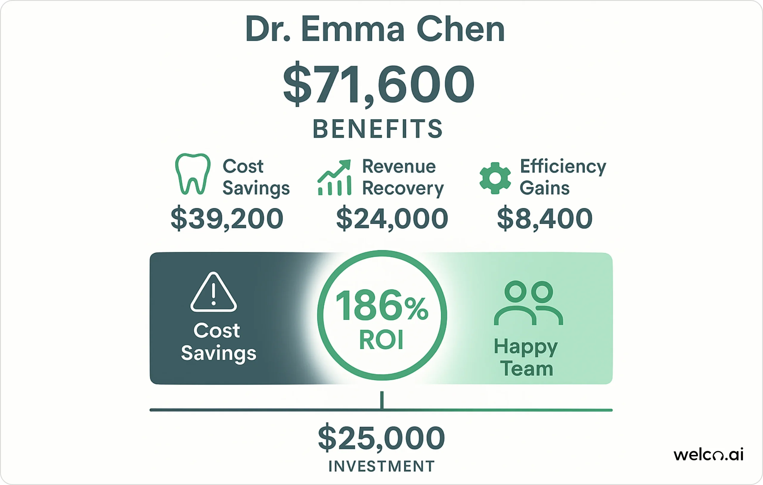 Emma’s practice saved $39,200 annually by eliminating two part-time positions. “I was spending more time managing reception staff than treating patients,” she confessed.