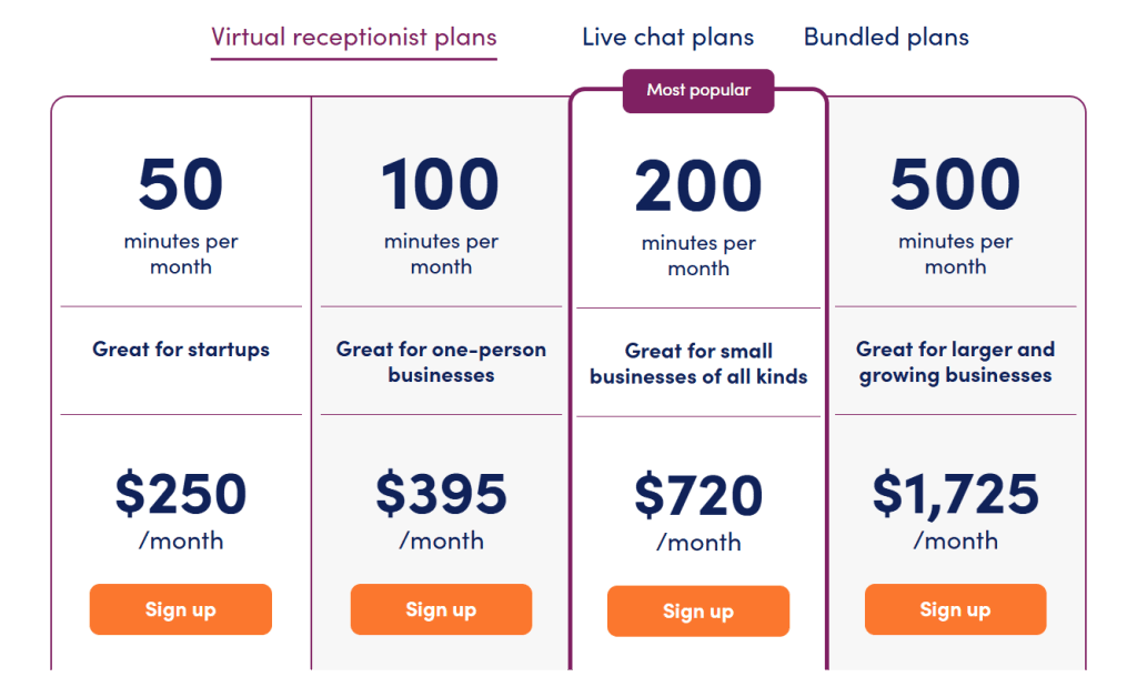 Ruby uses a transparent, inclusive pricing model with no hidden fees for activation, onboarding, setup, customization, or holiday coverage. Every plan includes access to the same team of trained virtual receptionists and all core features—only minute allocations differ between tiers.