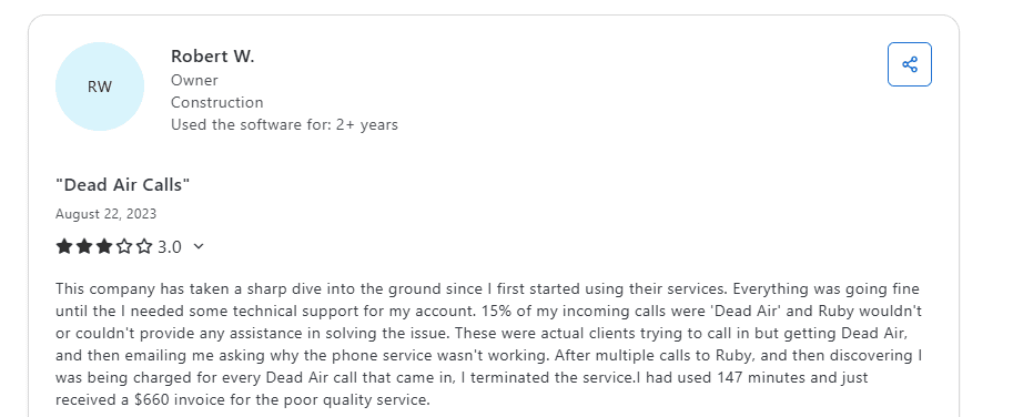 The most consistent complaint across every review platform is Ruby’s pricing. Users repeatedly describe the service as “overpriced” compared to competitors and they also charge for the dead air calls. This affects the budget of the users and they have to pay more for the virtual assistant receptionist.