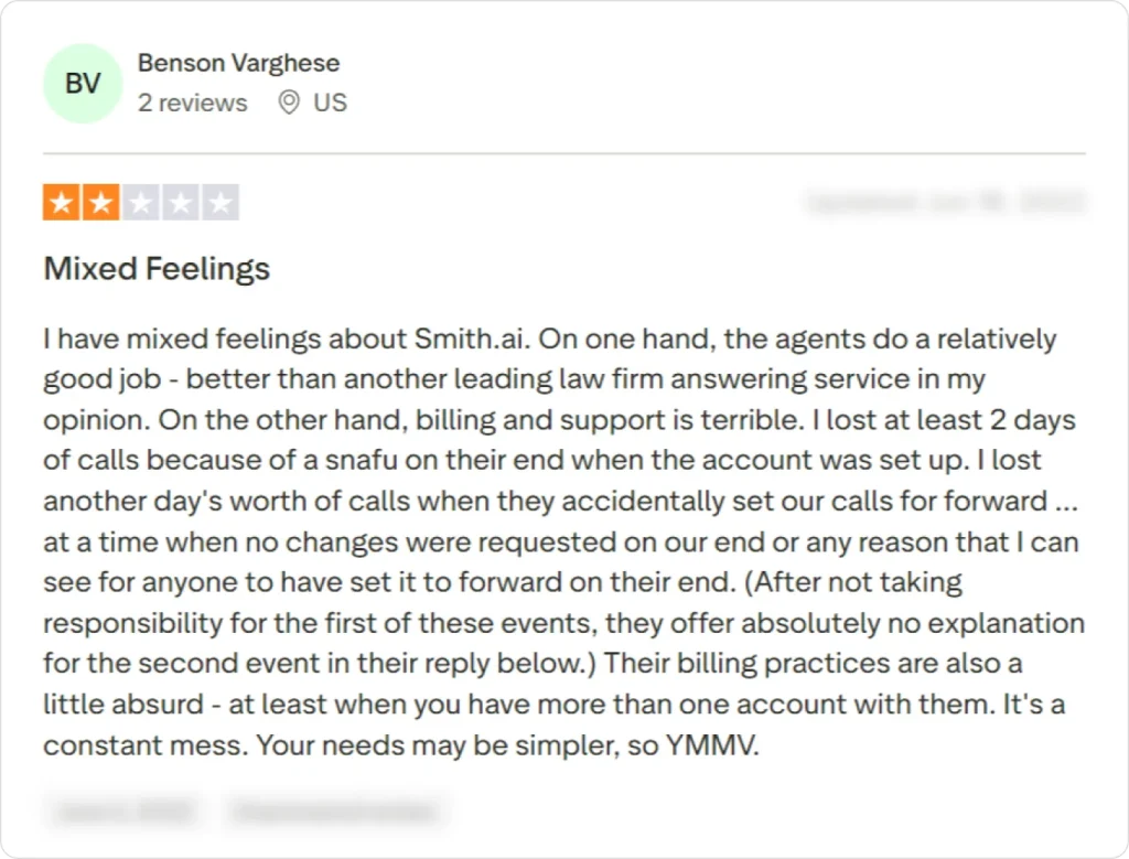 Smith.ai’s structure can feel complex for solo professionals or small firms, especially when call volumes vary month to month.