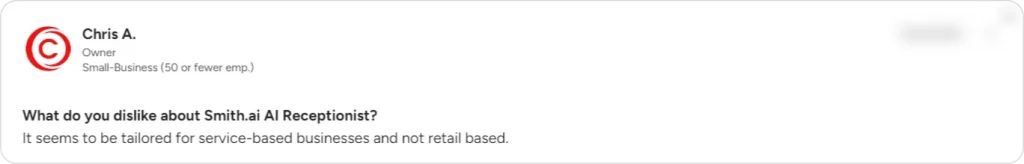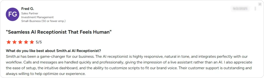 “When I first signed up, Smith.ai’s AI would ask the caller for all their information and then transfer them to a live person, who would ask for the same details again—annoying prospects and making the process less smooth.”
