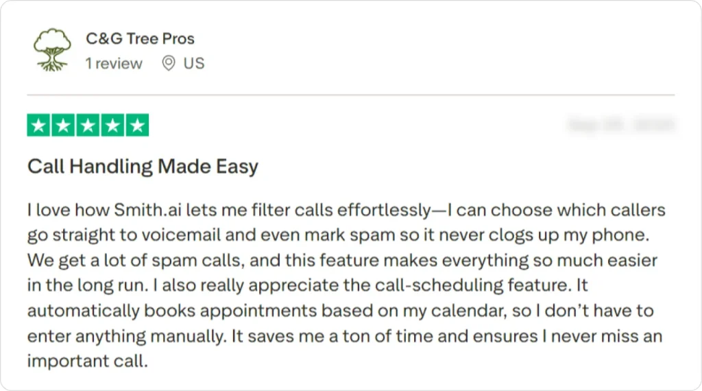 “Smith.ai lets me filter calls effortlessly, mark spam to keep my phone clear, and automatically book appointments based on my calendar—saving tons of time and ensuring I never miss important calls.”