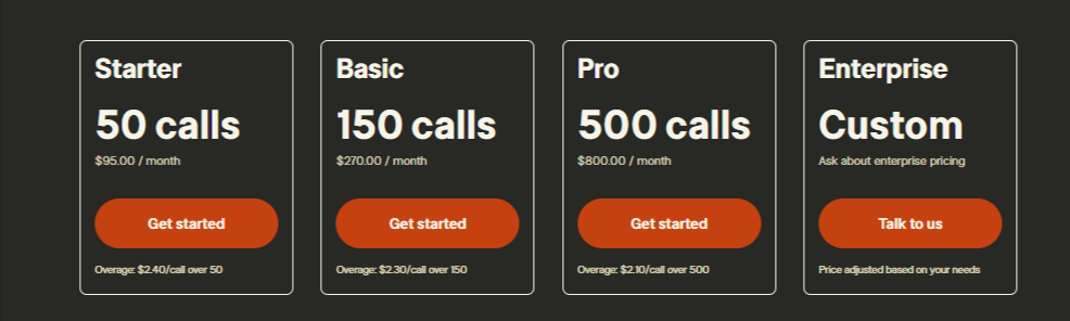| Starter | 50 calls | $95.00 | $2.40 per call over 50 |