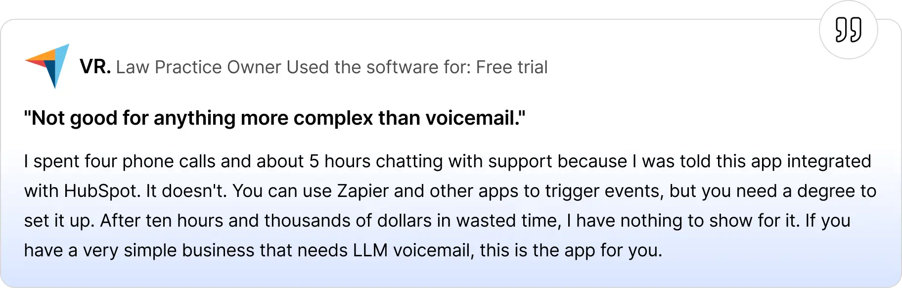 | Affordable entry point at $99/month with 200 minutes included. | Zapier integrations are complicated—often requiring external help despite marketing claims. |