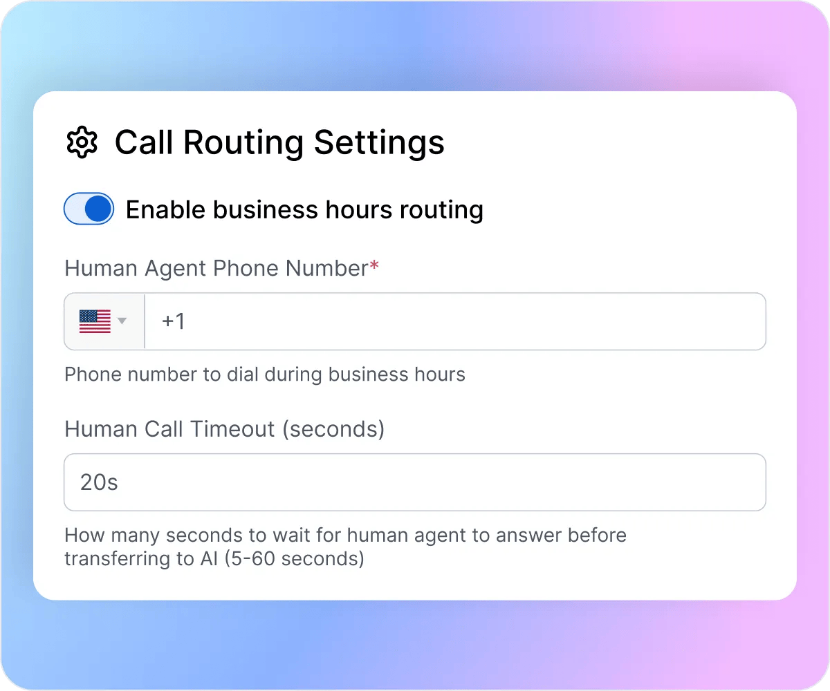You define the rules during setup. Configure specific keywords that trigger immediate transfers (such as “emergency,” “urgent,” or custom terms for your business), set timeout periods when your staff doesn’t answer, and establish business logic for different call types.