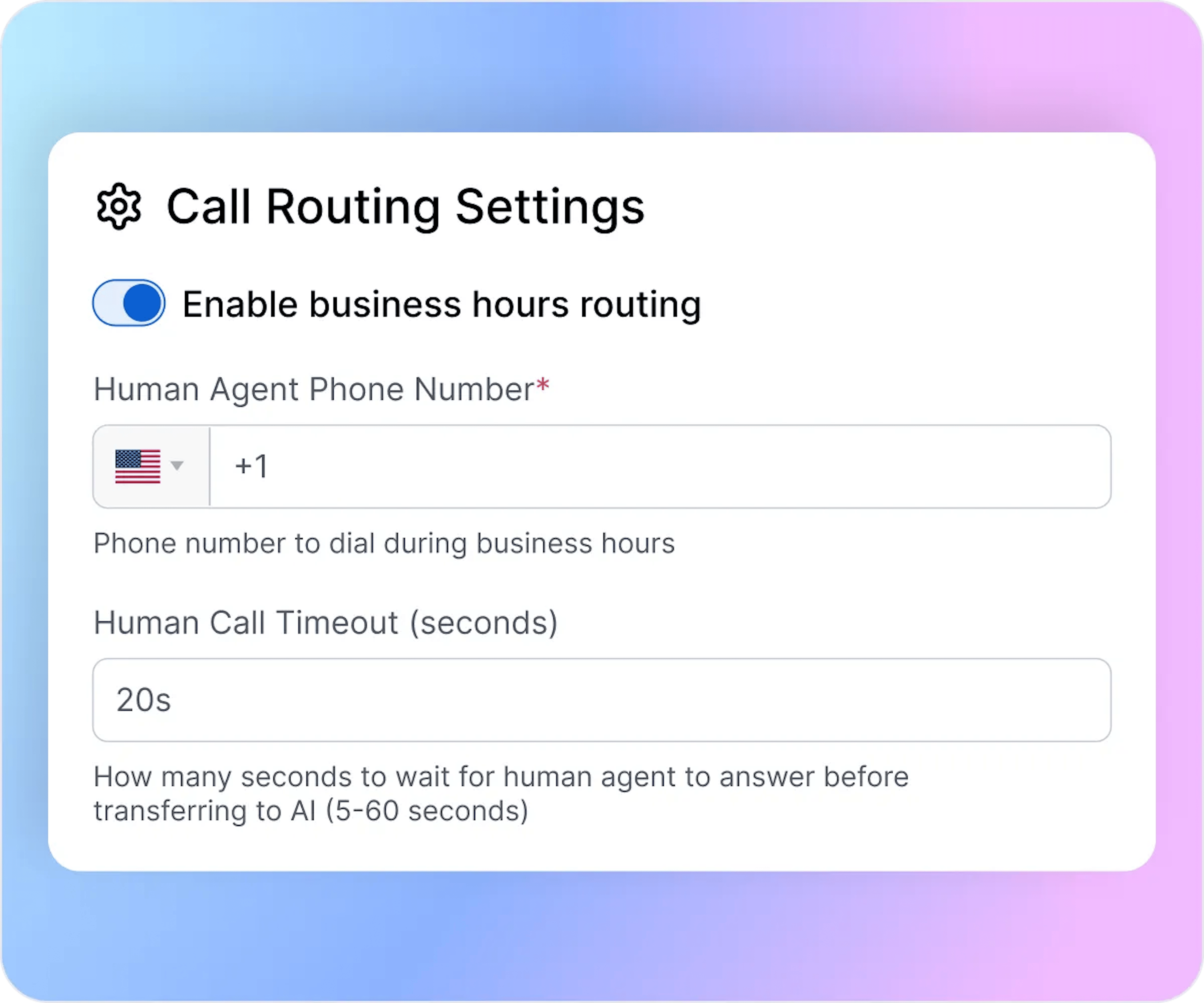 Configure when calls transfer to AI based on your team’s capacity. If staff don’t answer within 20 seconds because they’re busy, overflow routes to your AI receptionist immediately—no busy signals or voicemail.