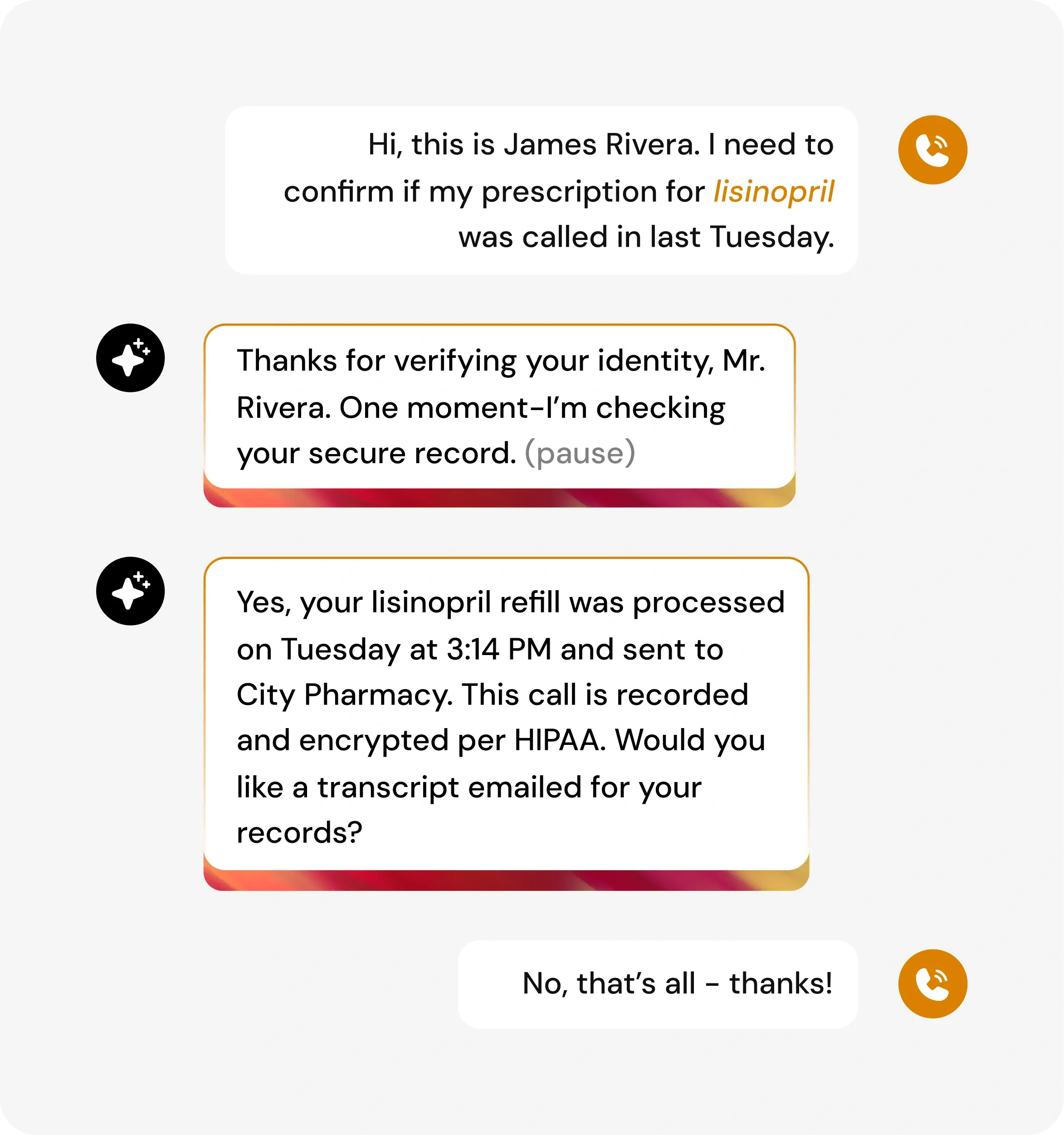 Every conversation is automatically recorded, transcribed, and encrypted for your security. Search transcripts for specific medications, symptoms, or patient names months later. Sentiment analysis flags callers who are frustrated for follow-up. Complete audit trail for compliance, liability protection, and quality assurance. Export call logs as CSV for billing documentation or medical record integration.