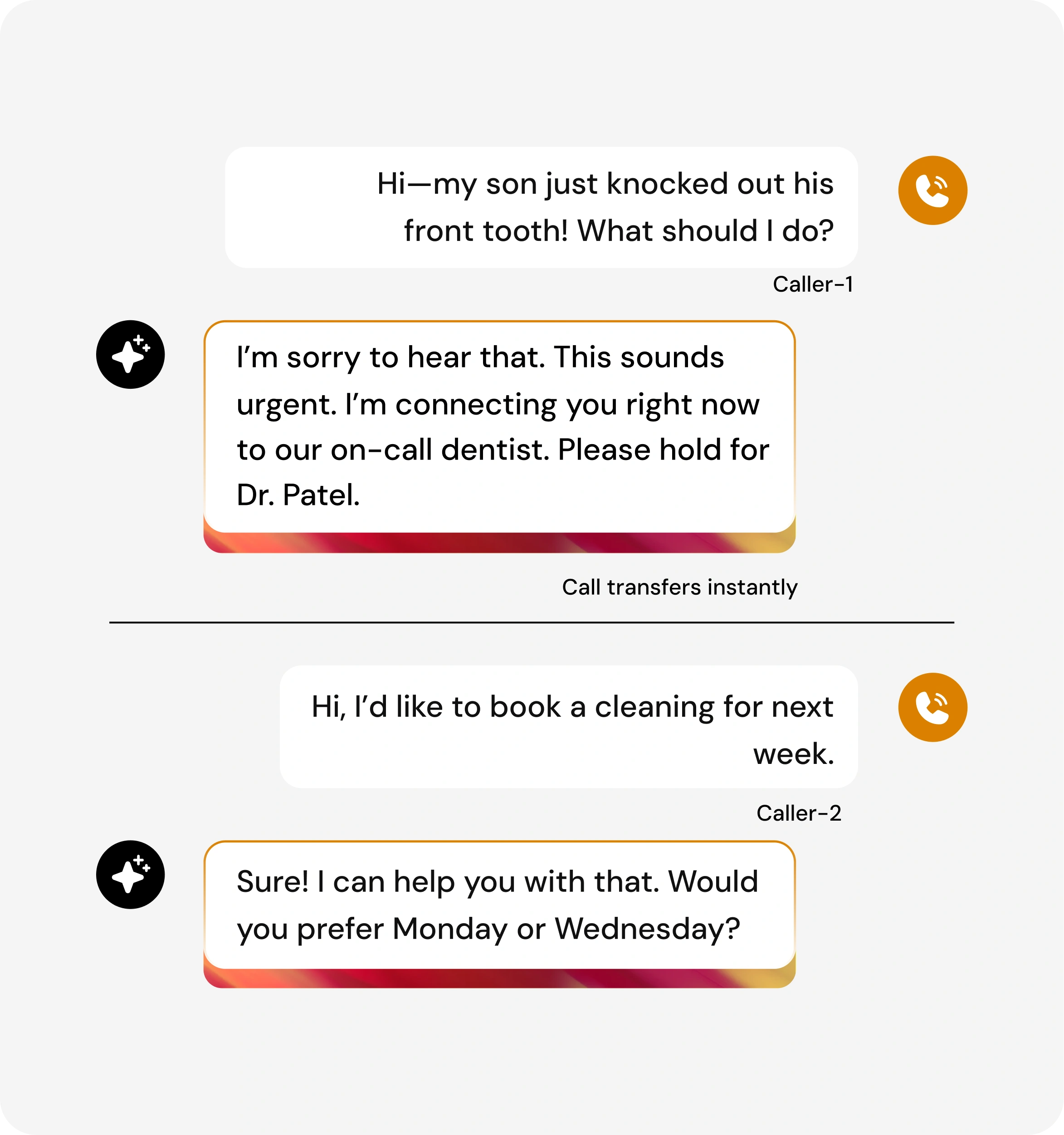 Welco recognizes true emergencies the moment patients describe them. Keywords like “severe pain,” “knocked-out tooth,” “broken crown,” “abscess,” or “facial swelling” trigger immediate routing to your on-call dentist with full context. Transfers appointments—cleanings, checkups, cosmetic consults—get scheduled normally. Your emergency protocol runs automatically, ensuring urgent cases get immediate attention while routine requests don’t interrupt patient care.