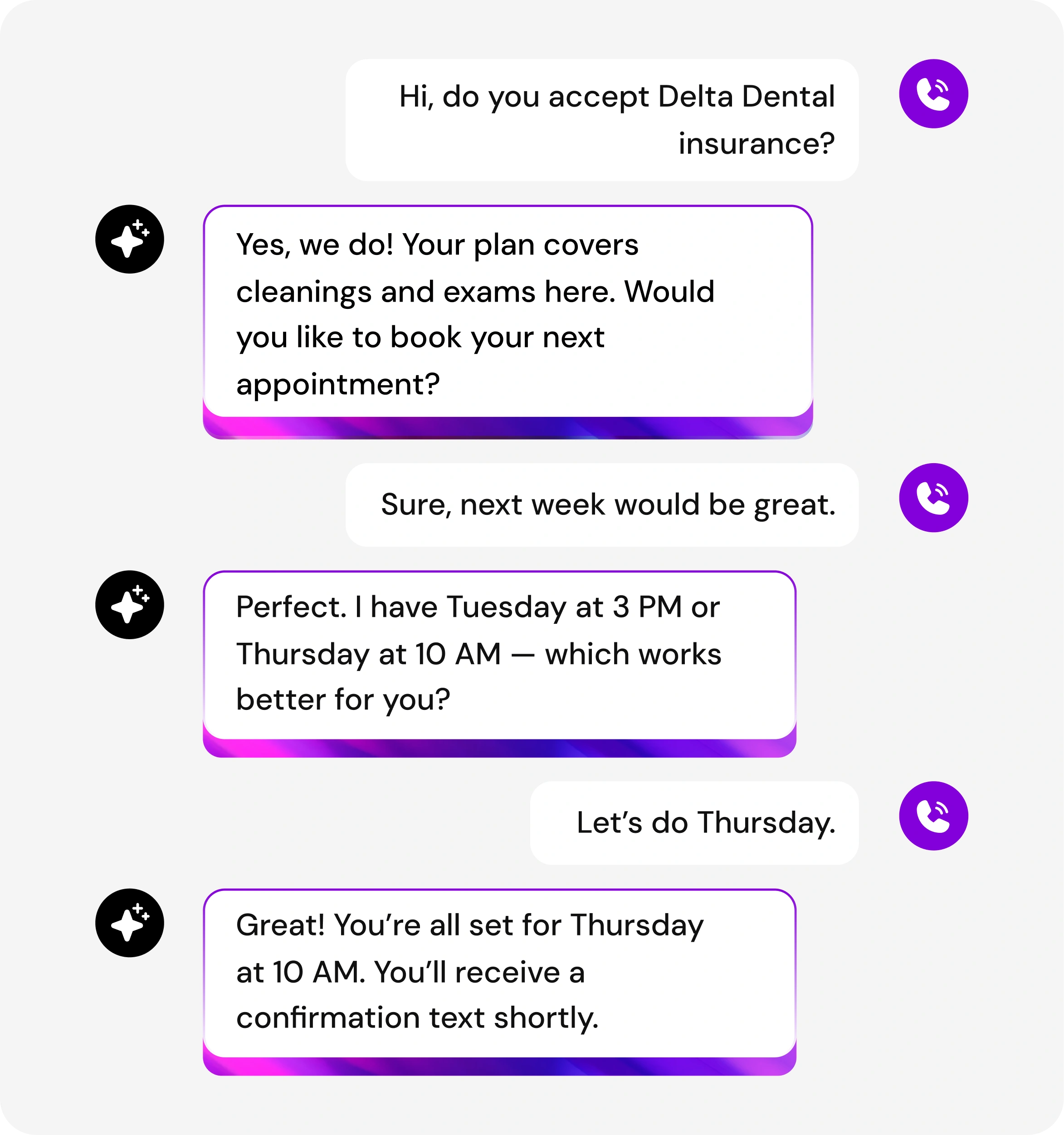 Your receptionist spends 30 minutes explaining Delta Dental coverage, out-of-pocket costs for crowns, and whether you’re in-network. Three more calls come in. Patients waiting at checkout get frustrated. New patient calls go to voicemail because your staff is buried answering “Do you take my insurance?” repeatedly. Hours vanish on repetitive questions when urgent appointments need scheduling.