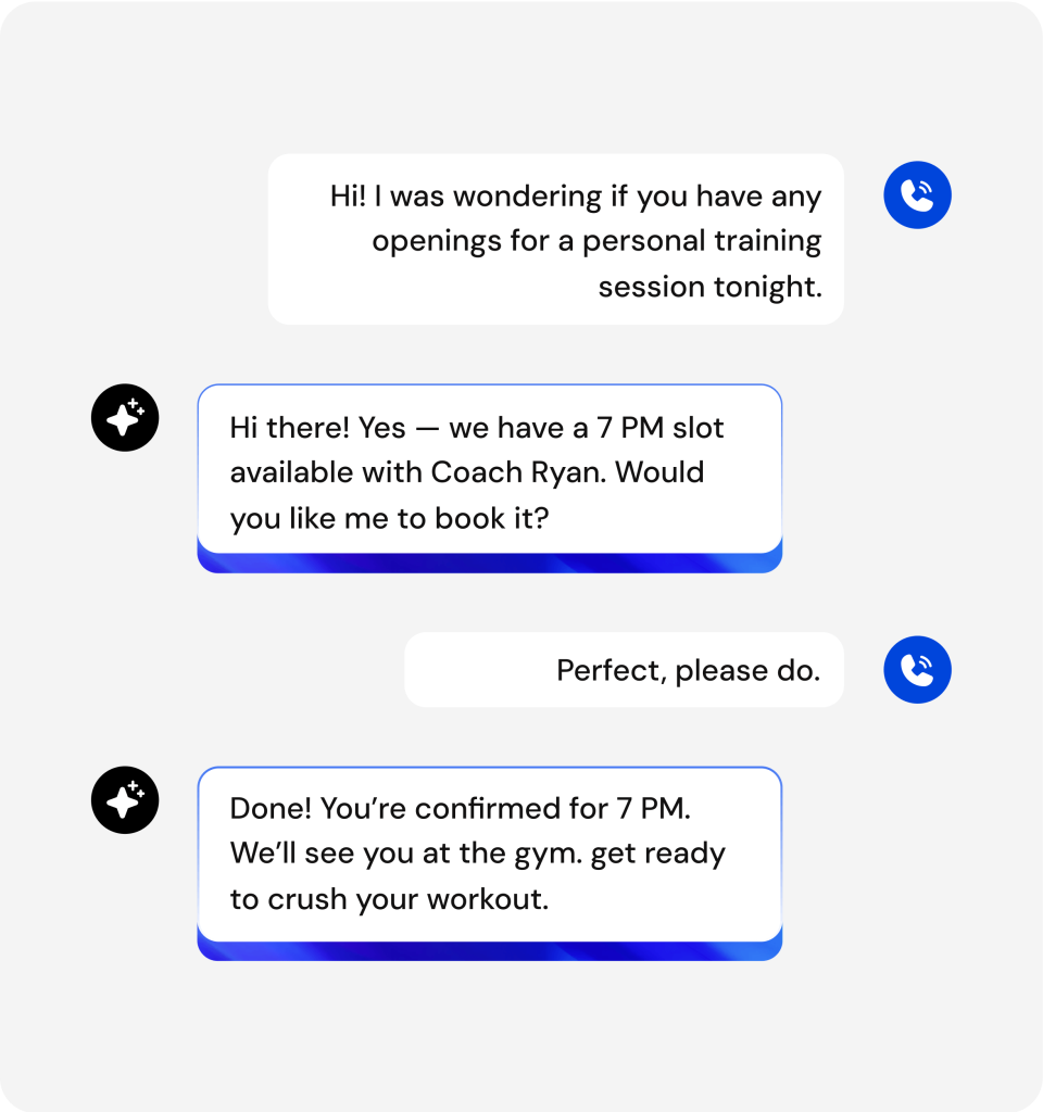 Someone searches “gyms near me” and calls five locations. Your front desk is processing a new member sign-up and can’t pick up. The third gym she calls has an AI answering service that answers immediately, explains membership options, and books her tour for tomorrow. You check your missed calls an hour later—that potential member is already visiting another facility.