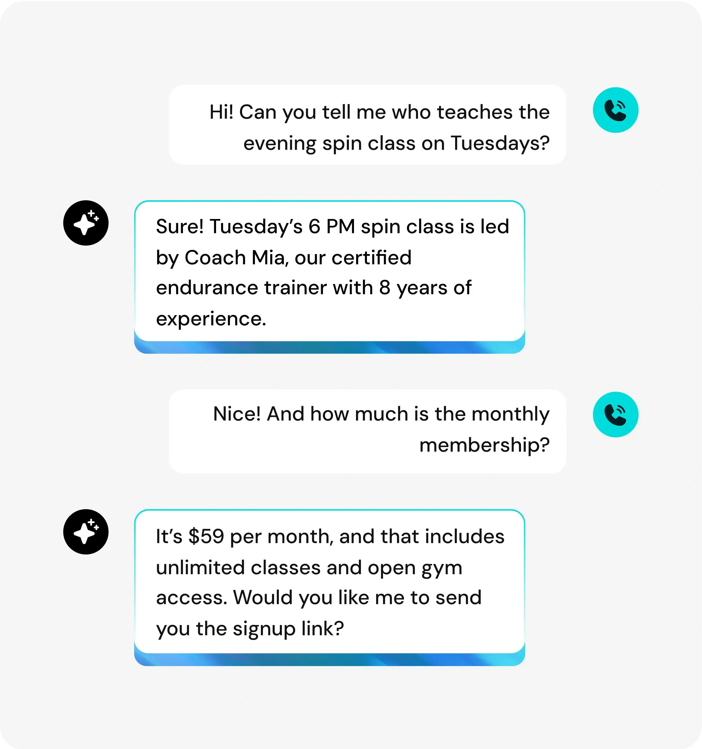 “What are your membership prices?” “Do you have a pool?” “What classes do you offer?” “What time do you open?” Your front desk answers these 40 times daily. Between repetitive questions, they’re interrupted constantly while trying to help members in person. Hours disappear on basic inquiries when your staff should be giving tours, selling personal training, and helping existing members.